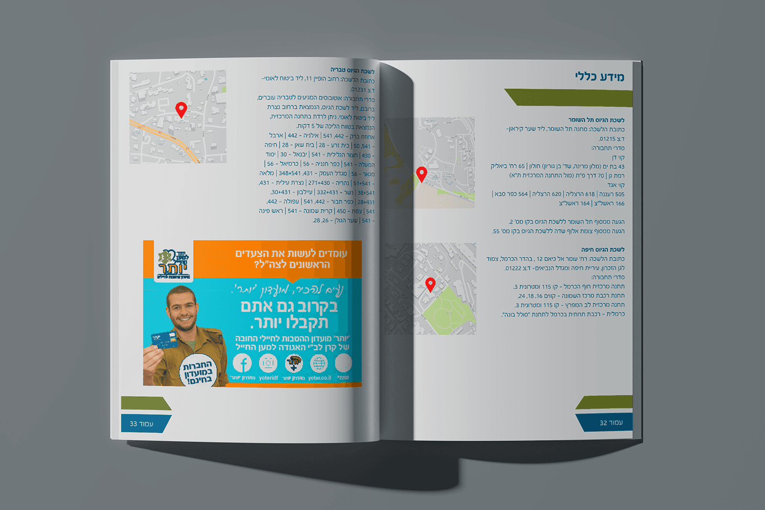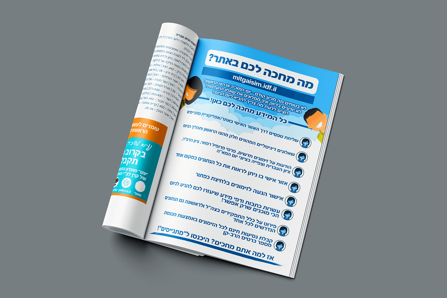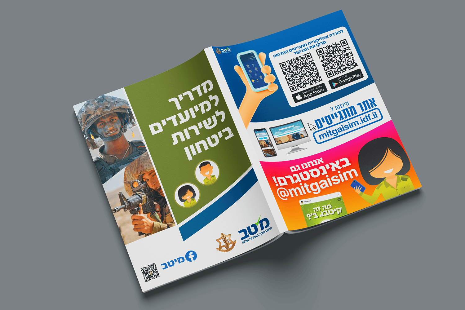 I had the opportunity to personally Direct and produce the Branding and Layout Design of The Official Recruitment Information Booklet of the Israel Defense Force. A 40-pages long, soft cover-paperback booklet, designed to align with the brand and visual identity guidelines of the Meitav Unit - the MEPR Military Body, which oversees the drafting and recruitment process for the Military. Following the deisgn, I continued to oversee and coordinate the printing production and implemented recurring monthly updates to the document’s content to reflect evolving military regulations, a responsibility I carried out until June 2023. The goal was to create a format that felt clear, structured, and welcoming, ensuring that young recruits could easily navigate the document as they began their enlistment journey. This project was carried with the Digital Marketing Division's Studio of Meitav Unit under the Personnel Directorate.