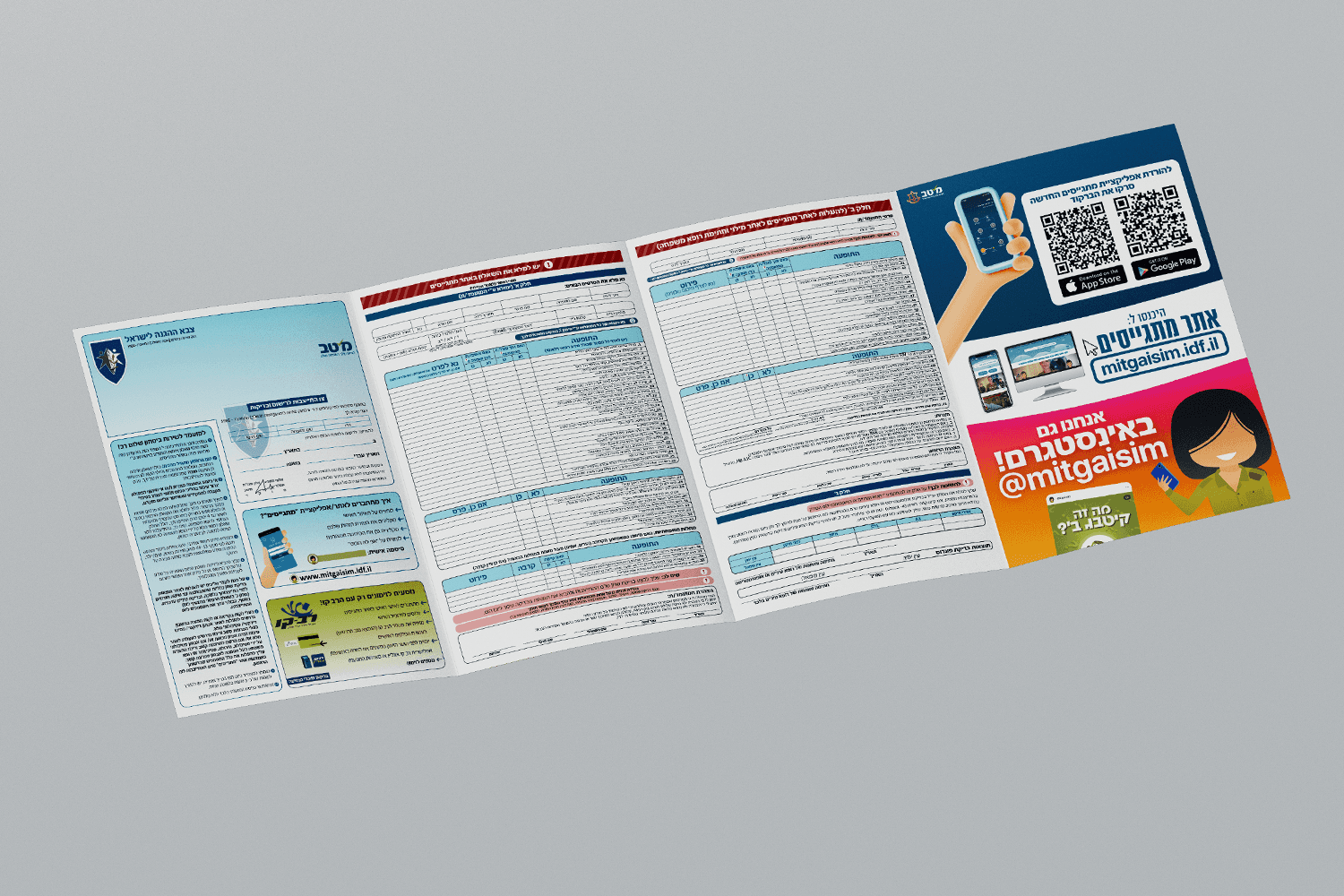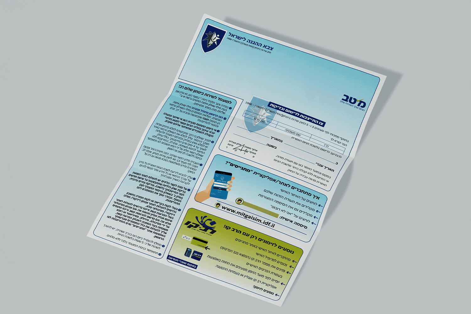 I had the opportunity to personally lead and produce the modern redesign of Tzav Rishon - The Official Drafting letter By the IDF. The design was developed in alignment with the branding guidelines of the Meitav Unit and the MEPR Military Body, which oversees the drafting process. Following the redesign, I continued to oversee and coordinate the printing production and implemented recurring monthly updates to the document’s content to reflect evolving military regulations, a responsibility I carried out until June 2023. The goal was to create a format that felt clear, structured, and welcoming, ensuring that young recruits could easily navigate the document as they began their enlistment journey. This project was carried with the Digital Marketing Division's Studio of Meitav Unit under the Personnel Directorate.